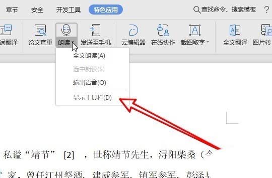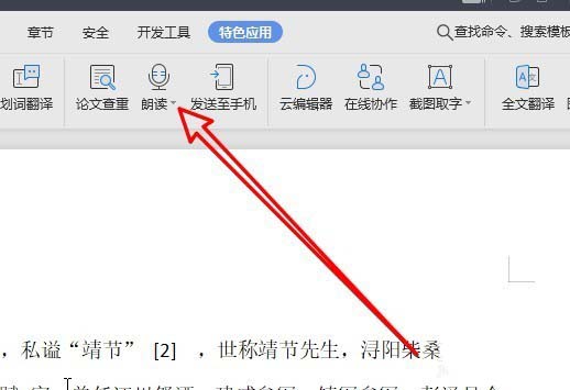 2、在打开的特色应用工具栏上点击“朗读”的下拉按钮。