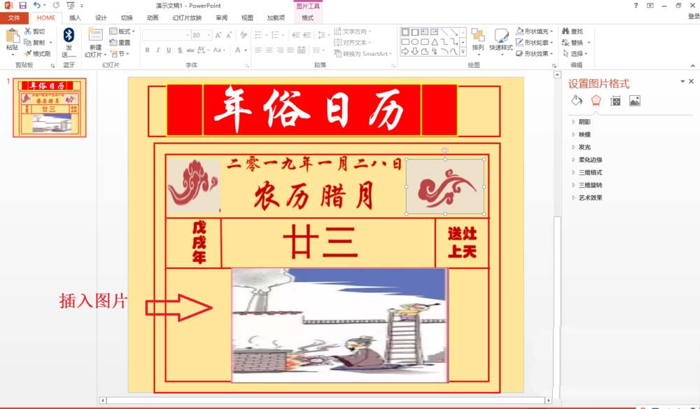 6、最后,找一些有关年俗图片,如腊月廿三送灶上天的图片,同时也插入一些过年氛围的图片进行修饰。