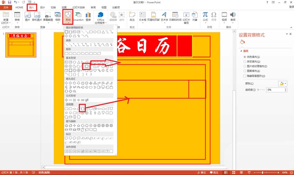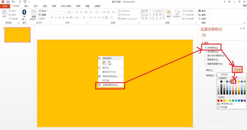 1、先制作日历的框架:打开PPT2013,删除文本框——右击页面——设置背景格式——纯色填充——颜色选择橙色或者金色。