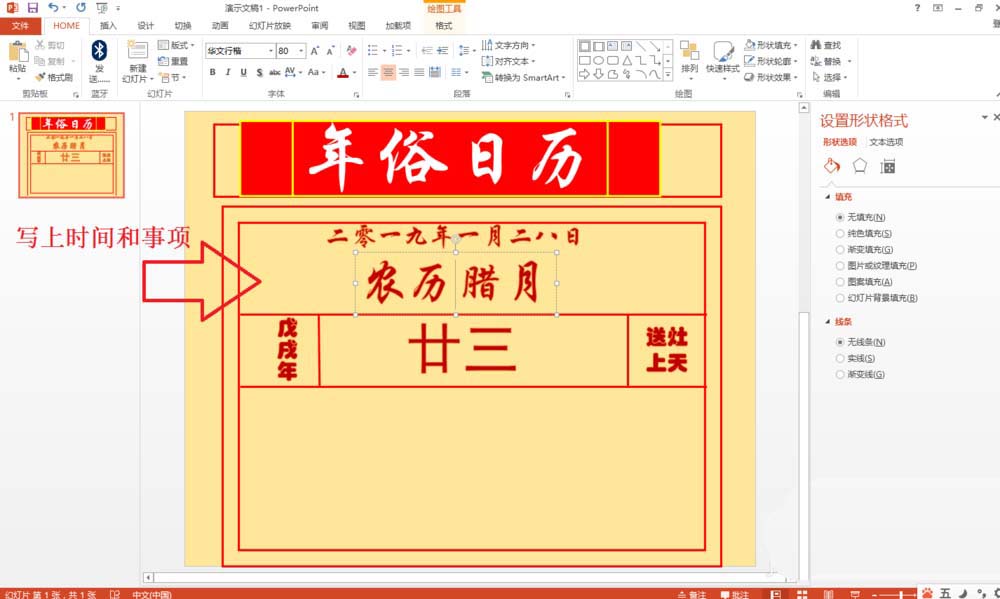 5、写上年俗的新历时间和农历时间写在图文框和预定义过程的形状那里,同时也把这一天的年俗习惯也写上去,设置好字体。