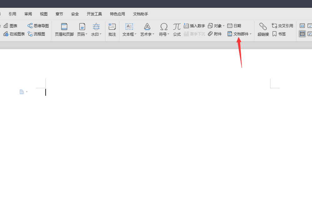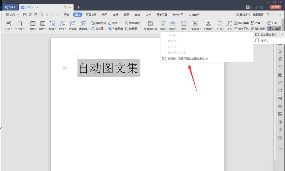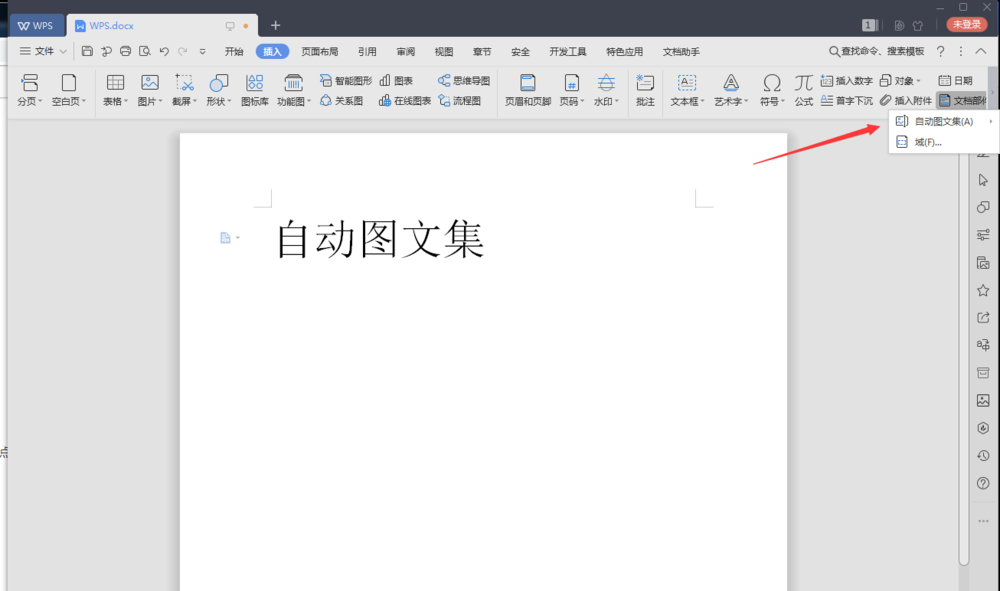 5、在文档部件下边会弹出下拉列表,我们可以看到有自动图文集还有域。