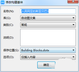 6、然后在“修改构建基块”窗口中就可以对该图文集进行修改了,改完后点击确定即可。
