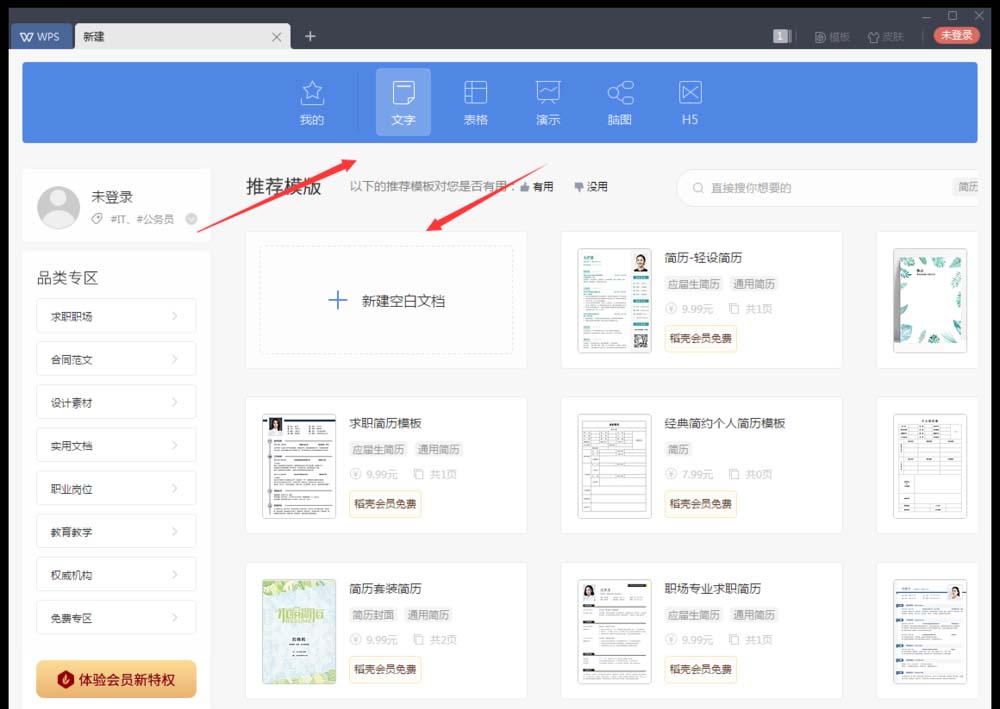 2、点击文字功能,选择新建空白文档,如果有现成的文档打开也是可以的。