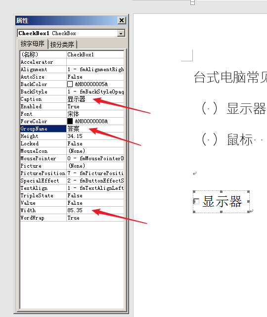 5、在左侧打开的属性设置窗口中,在Caption中输入答案选项文字,在GroupName中输入文字,比如答案,再观察控件的高度和宽度,分别在Width和Height中输入合适的数值。