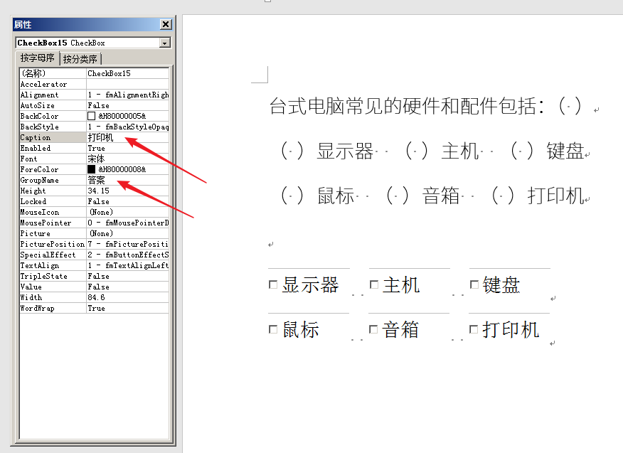 7、然后分别选中控件框,在Caption中输入答案选项,所有控件的GroupName务必保持相同(这是重点)。