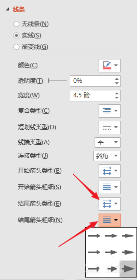 9、在右侧打开的设置窗口中,选择箭头类型和粗细。