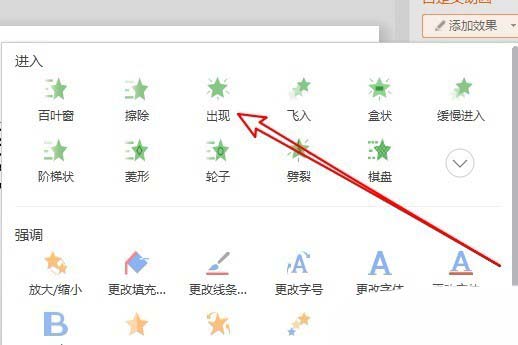 5、接着在弹出的菜单中我们点击“出现”的按钮。
