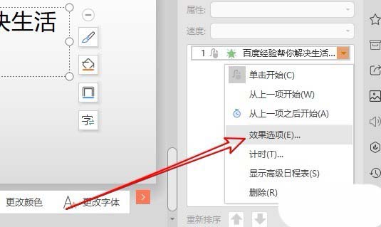 6、然后选中要编辑的文字,在弹出菜单中选择“效果选项”的菜单项。