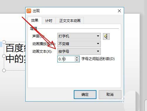 7、接着在打开的出现窗口中,我们设置声音为打字机,然后在下面输入延迟的秒数,最后点击确定按钮 ,这样就把选中的文字制作好打字效果了。