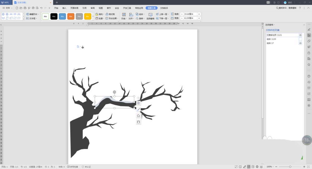5、梅花画好了,这样的枝干看着很生硬,没有一点立体的感觉,现实生活中的枝干都有痕迹,那么我们来给它也加点岁月的痕迹吧,使用任意多边形画出几道痕迹,并把遗漏的地方增加一些雪。