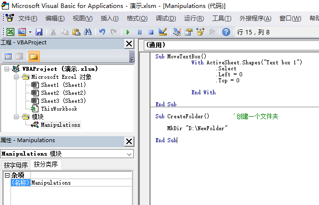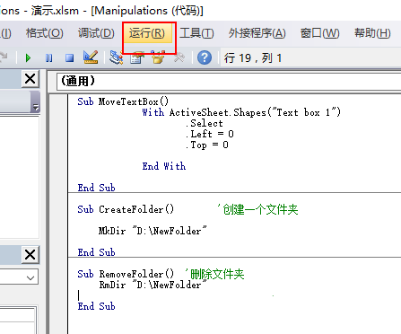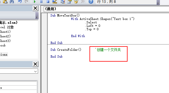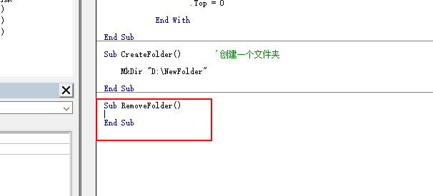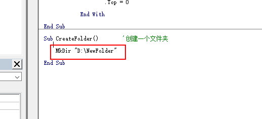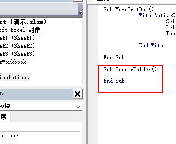 3、在任意一个模块里面新建一个子过程,命名为CreateFolder