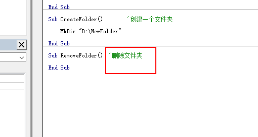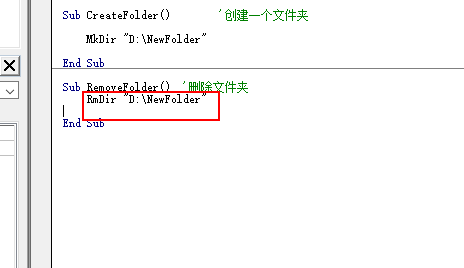 5、然后通过VBA 自带的方法RmDir函数来删除文件夹。