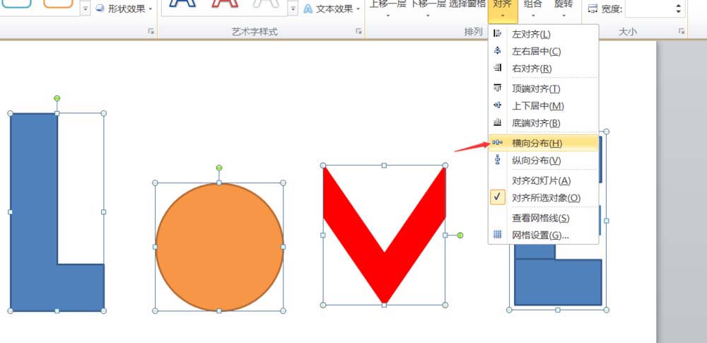 6、再接着我们选中我们插入的4个形状,然后点击横向分布,整齐均匀分布即可。