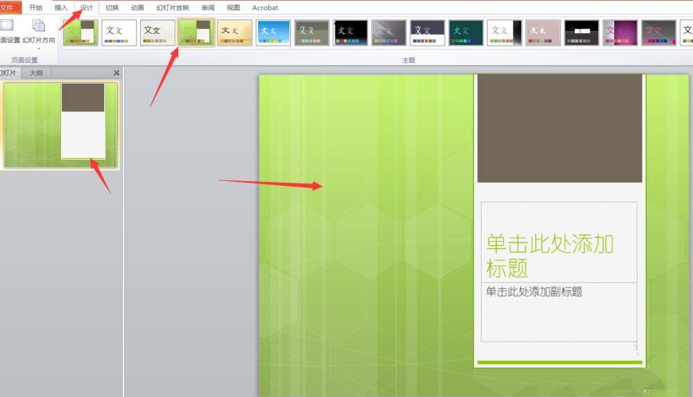 1、首先我们打开PPT软件,打开PPT之后。我们首先点击上方的设计,既然是植树节,我们选择设计的人主题就要偏向于绿色,如下图所示,小编选好了一个主题。