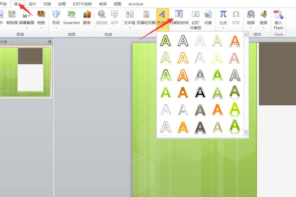 2、选好主题之后,我们首先点击上方的插入,艺术字,我们插入一个绿色的艺术字即可,如下图所示。