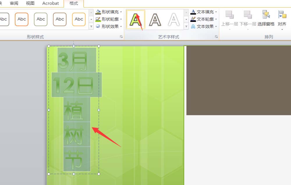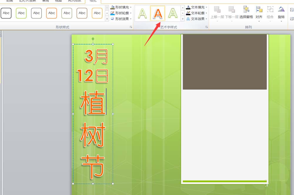 3、插入艺术字之后,我们在一数字输入的内容为3月12日植树节,选好艺术字的样式,如下图所示。