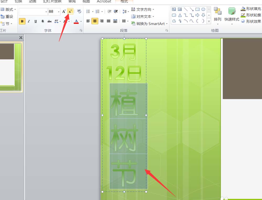 4、接着我们将植树节三个字,字号加大至88号即可,如下图所示。