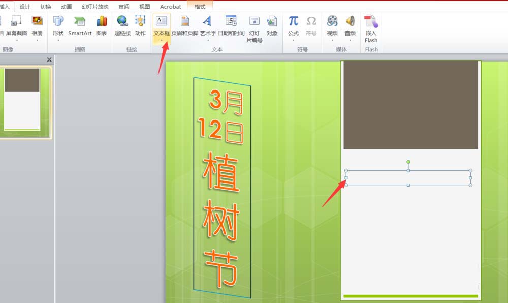 9、最后我们在中间的空闲部分插入一个形状,然后在形状里输入一些文字,文字内容为我们的植树节。