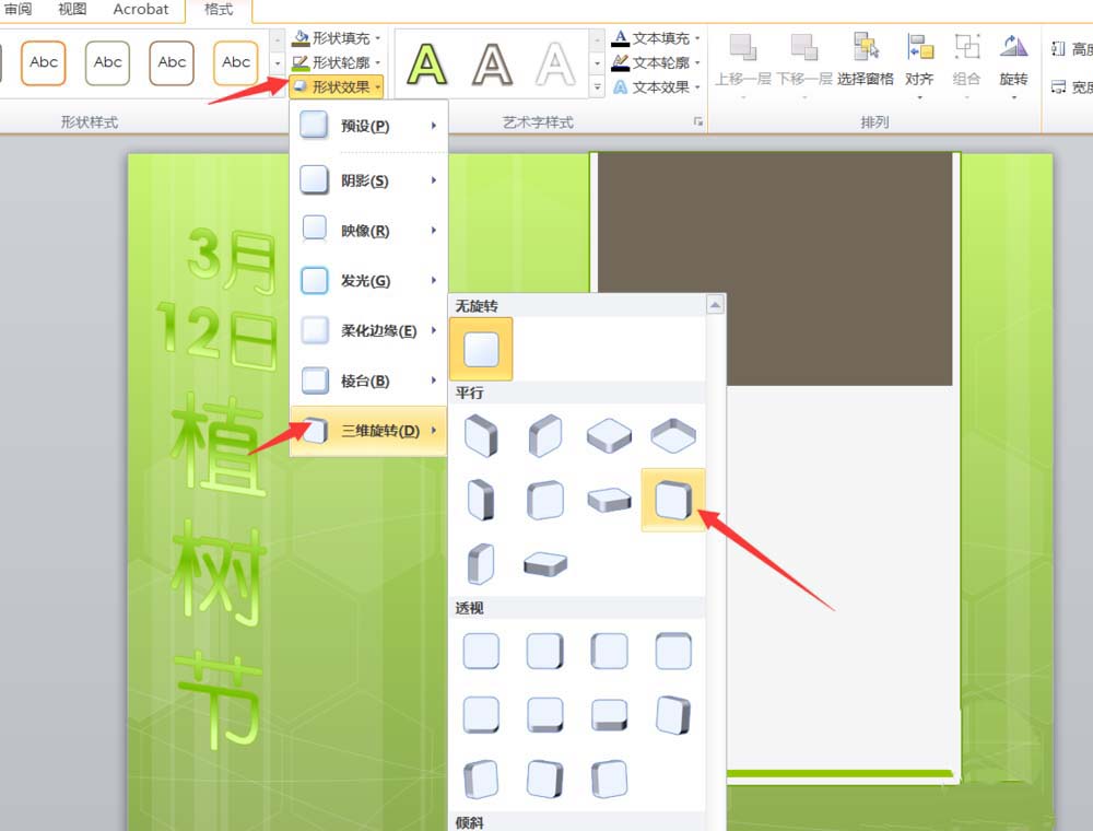 5、再接着我们设置一组艺术字的形状效果,设置艺术字的形状效果为三维旋转,棱台状即可,如下图所示。