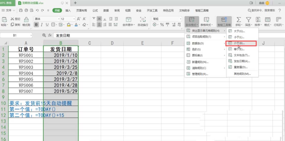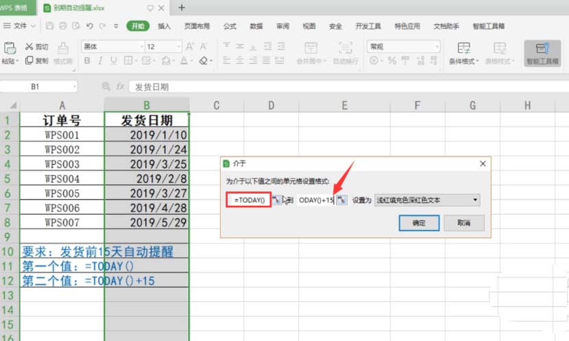 6、WPS2019将弹出“介入”的对话框。在第一个编辑框内输入=TODAY(),第二个编辑框内输入=TODAY()+15。这里的15就是发货前的提醒天数,如果是其他天数就改为其他数字即可。最后点击“确定”。