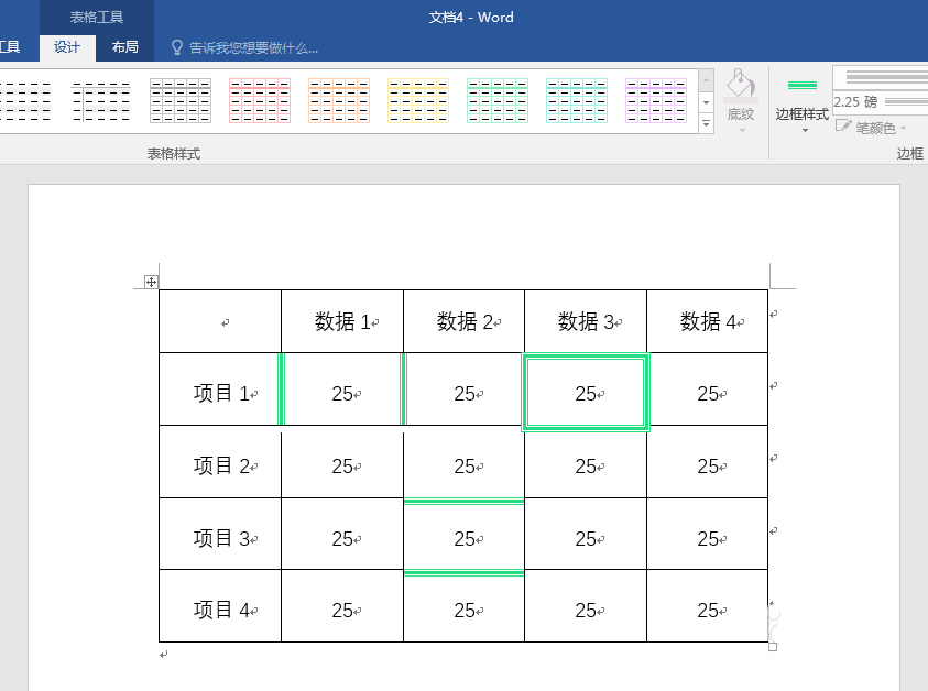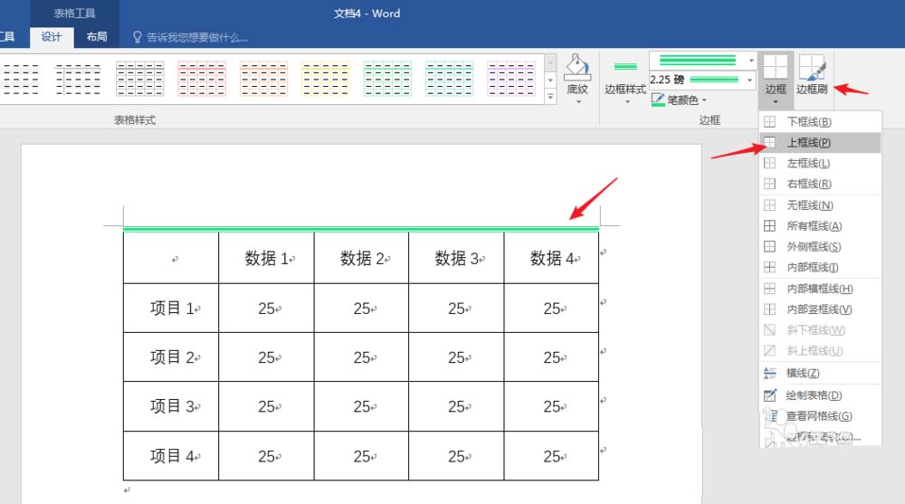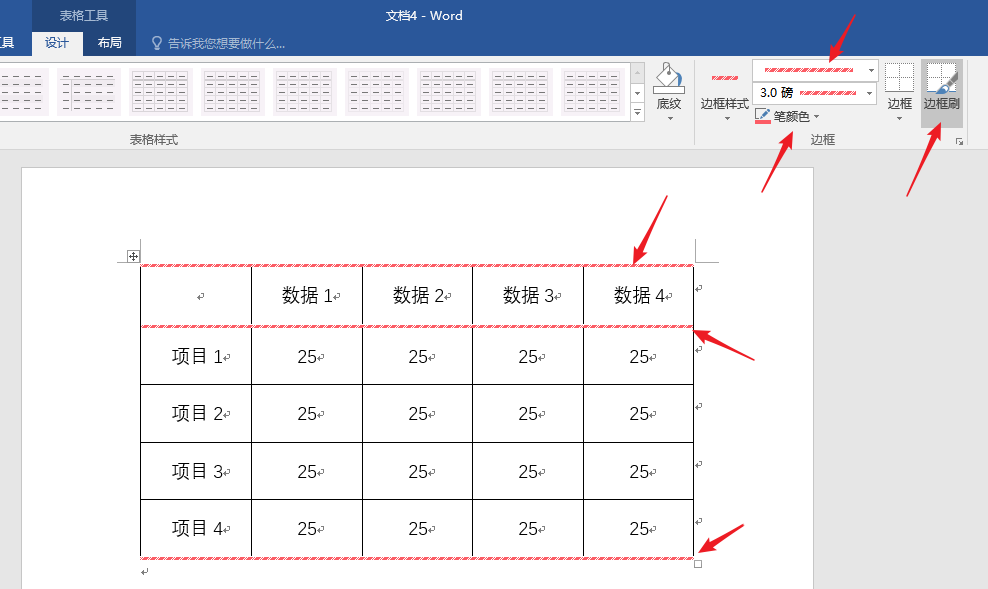 4、光标置于表格,在【表格工具】—【设计】—【边框】中修改表格边框样式。选择一种边框样式、粗细和颜色,则【边框刷】自动被开启,鼠标变成一支笔的形状,然后直接在表格边框中拖动即可。