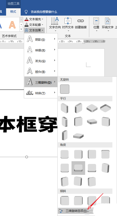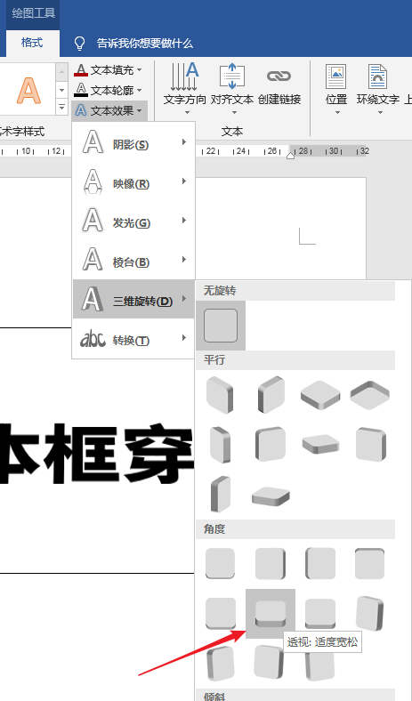 3、选中文本框,点击【绘图工具】—【格式】—【文本效果】—【三维旋转】—【透视:适度宽松】。