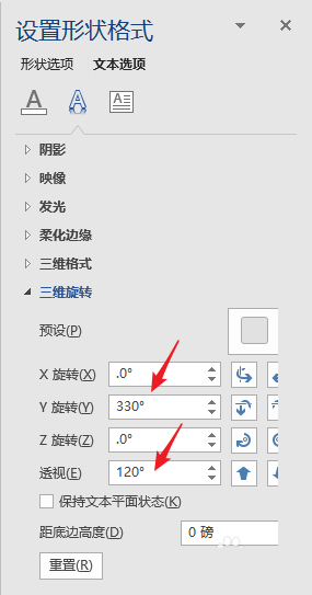 8、然后点击【三维旋转】,在【Y旋转】和【透视】中修改数值。