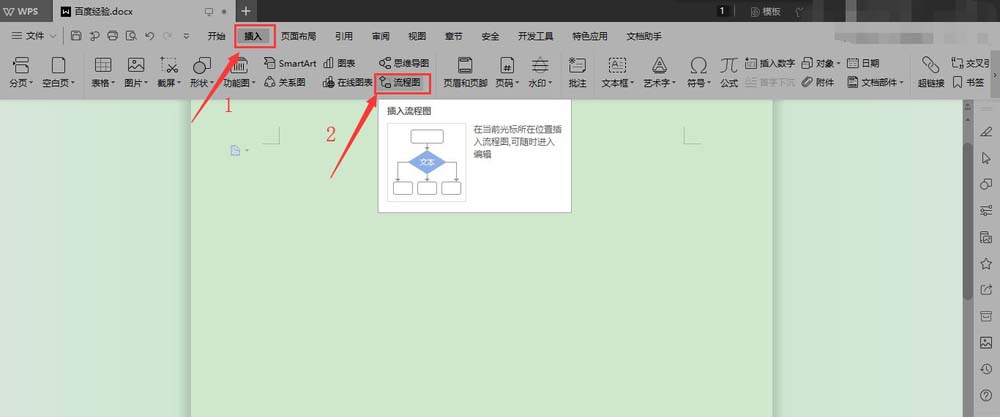4、此时再次选择“插入”→“流程图”,可以发现步骤3图2中不再存在“新建”按钮,那么要重新建立新的流程图该怎么办呢?