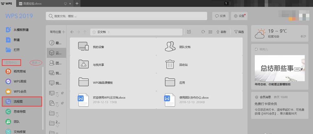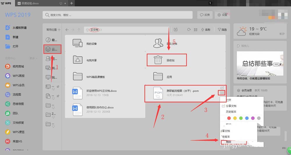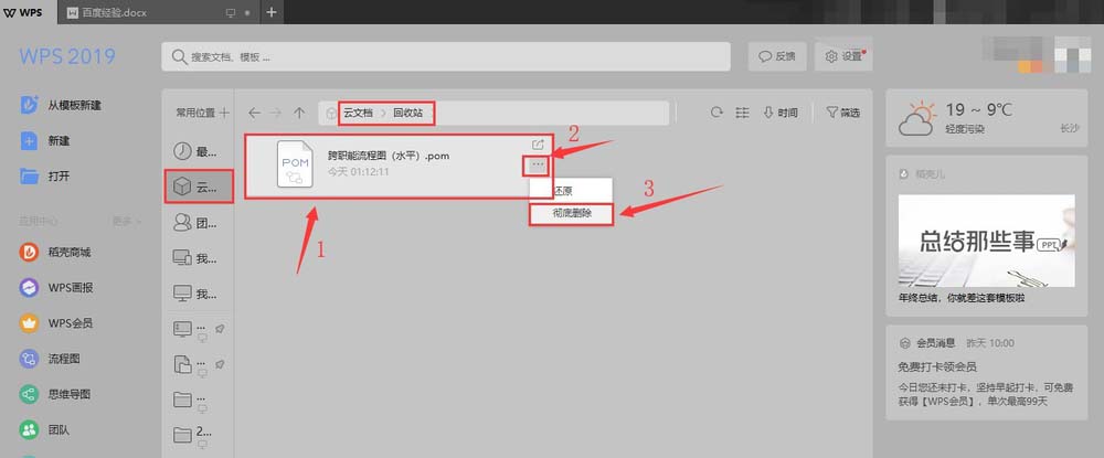 2、在WPS首页中间位置选择“云文档”,可以看到“跨职能流程图(水平).pom”文件,将其删除,再进入上方的“回收站”,找到相应文件名的文件,彻底删除。则再次回到文档后选择“插入”→“流程图”中已经显示没有历史记录(回归Ⅰ新建步骤1图2对话框)。