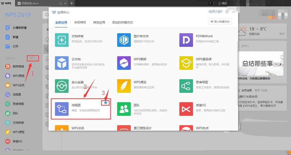 2、在WPS首页左侧“应用中心”选择“流程图”可以直接打开步骤1的图3(应用中心未显示该项的可在“更多”中找到相应功能点击右上角的星标添加)