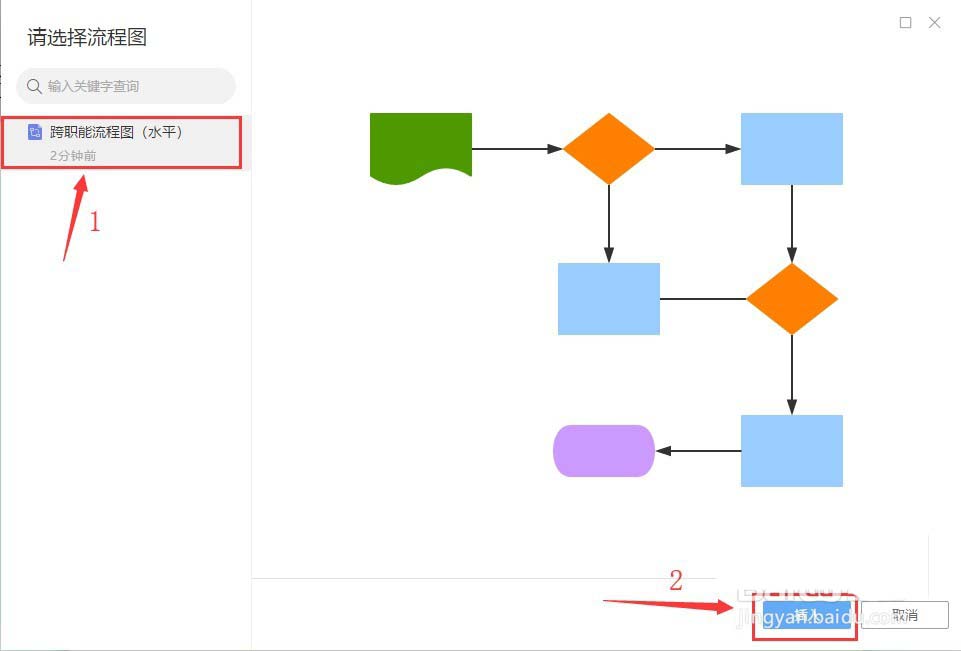 完成后直接关闭“新建流程图”界面,回到工作文档再次点击“插入”→“流程图”即可看到刚建立的“跨职能流程图(水平)”,如图2。选中该流程图后“插入”,完成在文档中插入流程图,如图3。
