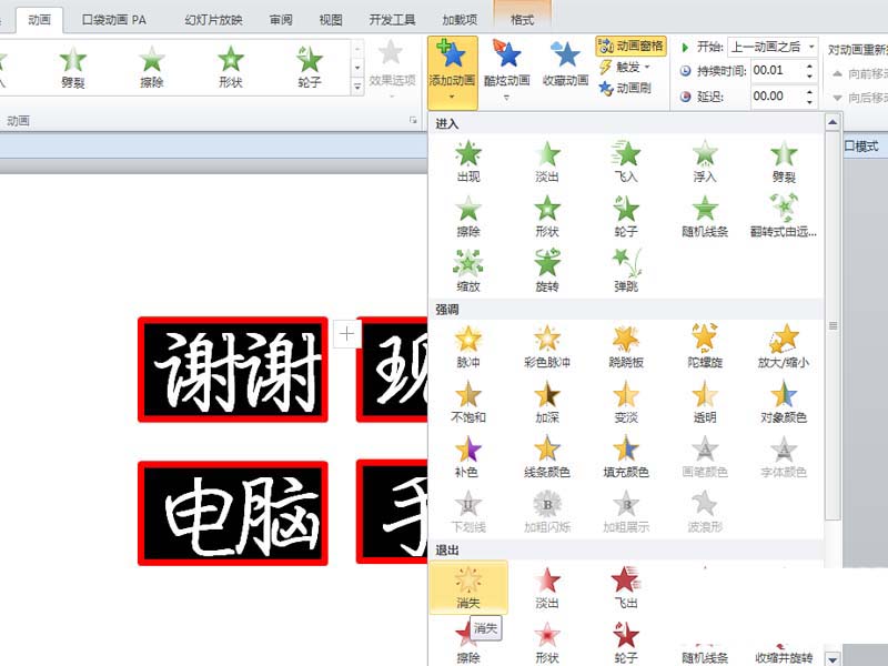 5、采用同样方法添加退出中的消失动画,设置延迟时间为0.01,开始为与上一动画同时。