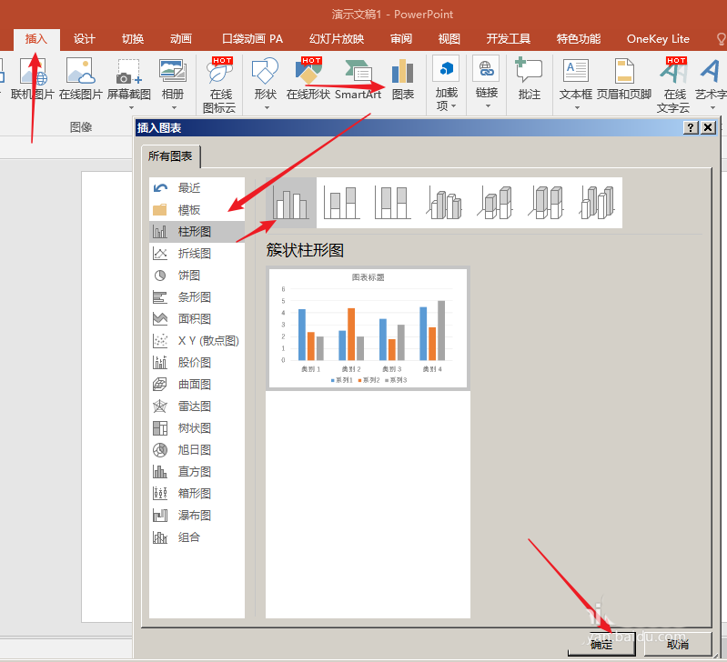 2、点击【插入】—【图表】—【柱形图】—【簇状柱形图】。