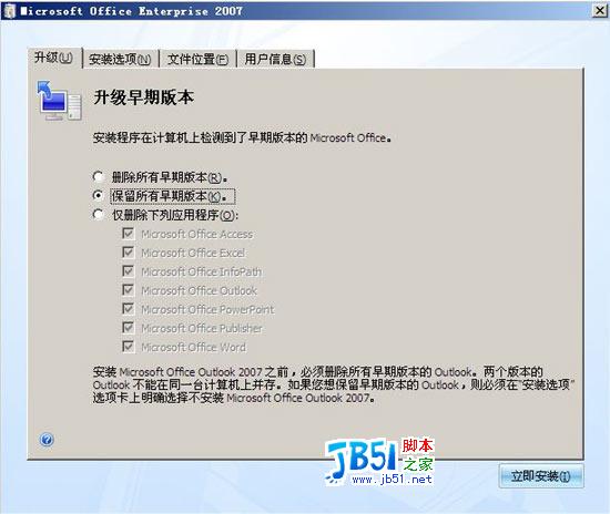 另外,还有一部分人只是想安装office2007来玩玩,工作中还是用office2003。这也没关系,微软对office安装的改进可以让office2007和office2003并存在一个系统中。运行office2007的安装,选择“自定义”安装,安装程序会自动扫描到系统中已经安装的office程序,并提示3种升级安装方式,选择“保留所有早期版本”,(图2)
