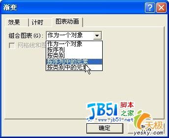 在弹出的“渐变”对话框中选择“图表动画”选项卡,然后单击“组合列表”框右侧的下拉按钮,在弹出的下拉列表中选择“按序列中的元素”项,如图4,单击“确定”按钮后就可以预览动画的效果了。