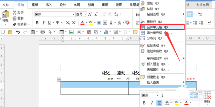 6、现在将第一行的两列进行合并,选取表格点鼠标右弹,在列表点【合并单元格】命令。