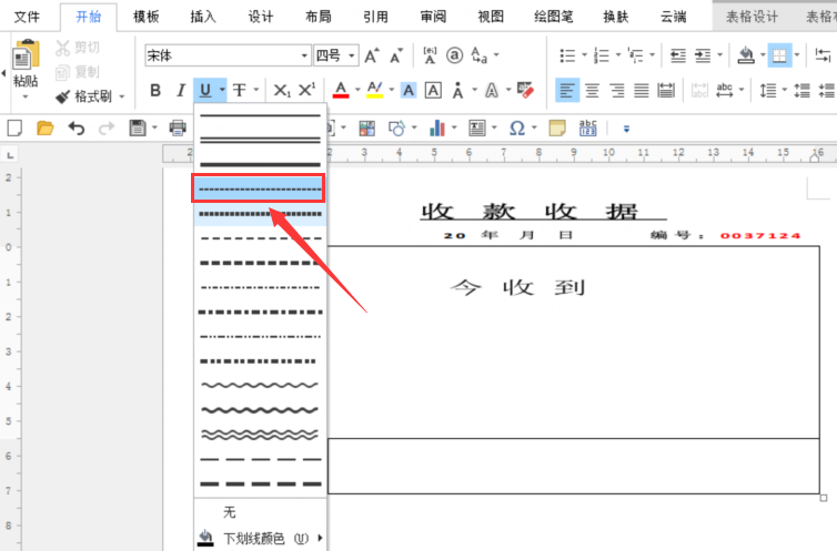 8、在表格内第一行输入今收到,注意空格调间距。在第二行选开始点【下划线】符号,选取线条样式,按空格键将会呈现下划线。