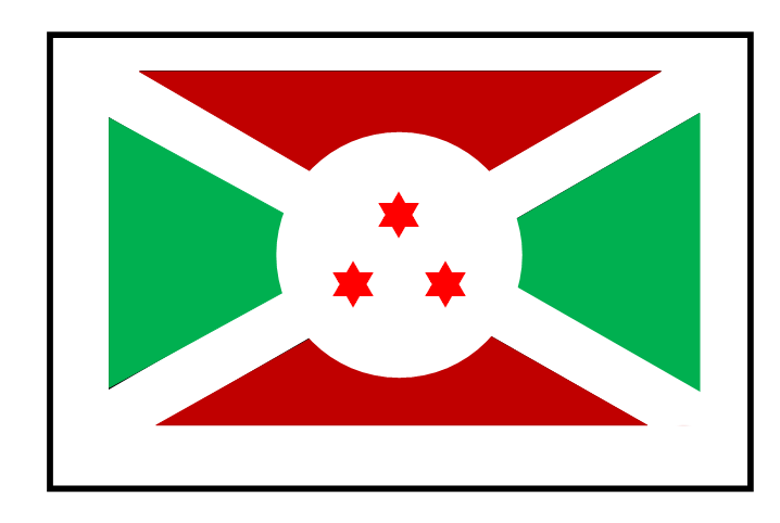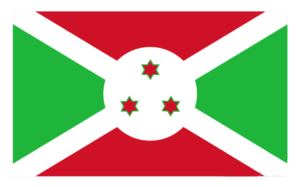 2、查阅资料得知:1.布隆迪国旗为长方形,长宽之比为5:3。2.两道交叉的白色宽条将旗面分成四个三角形,上下两个相等,为红色;左右两个相等,为绿色。 3.旗面中央是白色圆地,内有三颗带绿边的红色六角星,呈品字形排列。