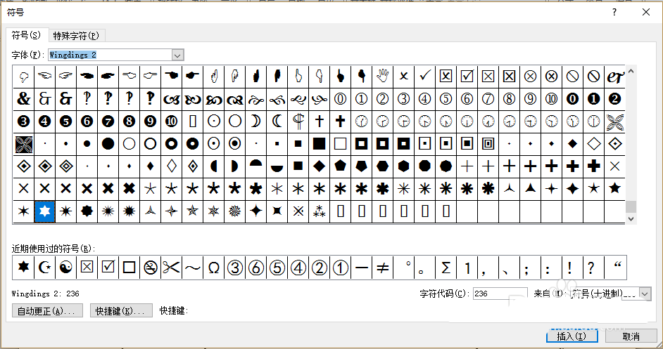 9、点击【插入】-【符号】-【其它符号】,弹出符号对话框,选择字体为“Wingdings 2”,点击六角星符号,点击插入。