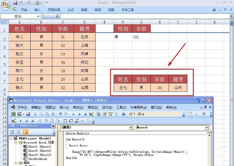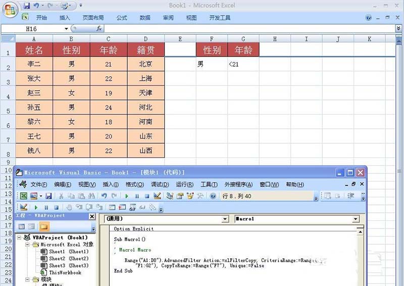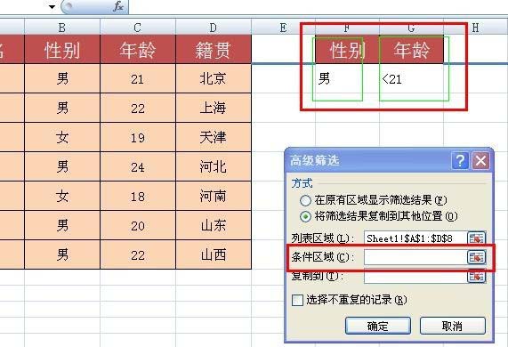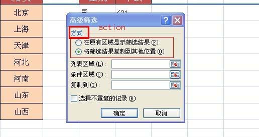 2、Action即过滤的方式,主要有两个值可用,分别是xlFilterInPlace、xlFilterCopy,前者表示过滤后数据仍放在原来的地方,后者指将筛选结果复制到后面CopyToRange参数指定的地方。