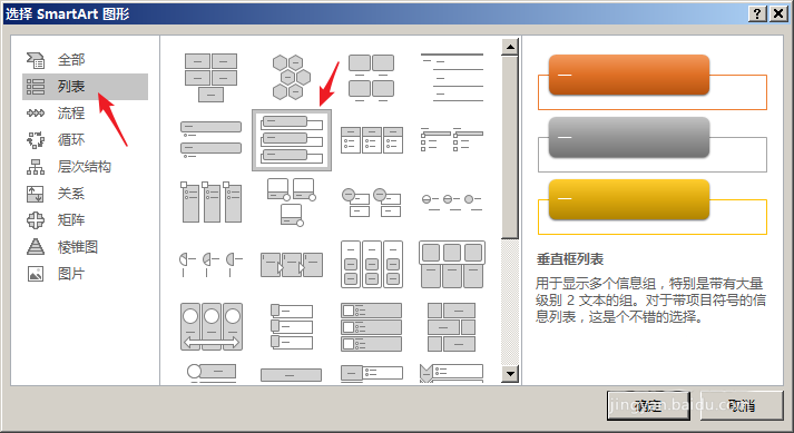 4、在打开的窗口中点击左侧的【列表】,在右侧列表框中有多种内置的文字列表图形,选择其中的一种。