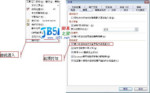 从工具栏进入“工具”下拉菜单的“选项”对话框,找到“编辑”标签,上面有个“自动更正”选项组,第一个选项为“键入时自动进行句首字母大写更正”,这就是句首字母大写功能的开关。单击选框打勾可开启句首字母大写功能,反之则关闭。如下图。