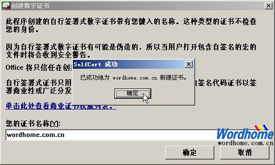 成功安装VBA 项目的数字证书后,在开始菜单的Office启动菜单中依次单击“Microsoft Office 工具”→“VBA项目的数字证书”命令,打开“创建数字证书”对话框。在“您的证书名称”编辑框中输入数字证书的名称(如wordhome.com.cn),并单击“确定”按钮。成功创建数字证书后单击“确定”按钮关闭“创建数字证书”对话框,如图2008061110所示。