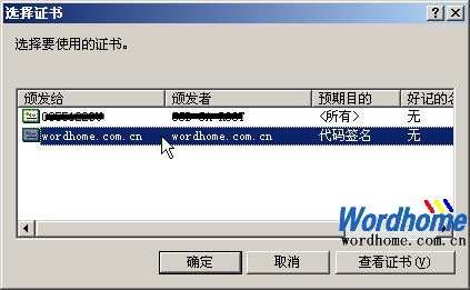 第2步,在打开的“选择证书”对话框中选中名称为wordhome.com.cn的数字证书,并依次单击“确定”→“确定”按钮,如图2008061112所示。