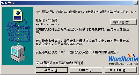 用户在使用Word编辑文档时可以借助Word宏命令提高工作效率。在默认情况下,Word宏的安全性设置为“高”,当运行Word宏命令时会自动禁用宏。如果将Word宏安全性设置为“中”,则每次运行Word宏会弹出Word宏安全警告对话框。而如果把Word宏的安全性设置为“低”来取消安全警告,则会增加恶意代码或病毒破坏的危险。为此,用户可以为Word宏添加VBA项目的数字证书签名,这样不仅可以取消Word宏安全警告,并且不会降低Word文档安全性。以Word2003为例,具体实现方法如下所述。