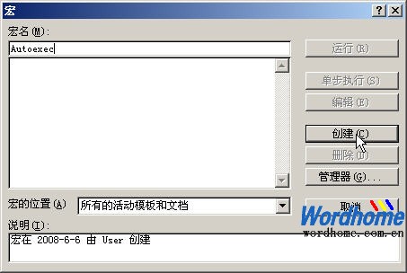 第1步,在菜单栏依次单击“工具”→“宏”→“宏”命令,打开“宏”对话框。在“宏名”编辑框中输入宏的名称(例如Autoexec),并单击“确定”按钮,如图2008060601所示。
