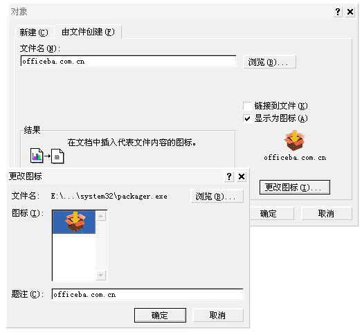 我们可以不接受默认图标,而是选择“更改图标”,如图所示。单击“浏览”按钮定位到默认所有者应用程序所驻留的位置,通常可以选择存储在特定的.exe文件中的图标。寻找需要的图标后单击“确定”按钮,再回到“对象”对话框后,进行其他选择后单击“确定”按钮。
