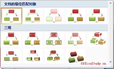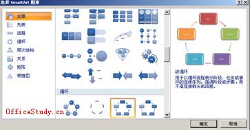 在Word 2007中增加了一个“SmartArt”工具,有了这个工具制作出精美的文档将变得非常容易。SmartArt图形主要用于演示流程、层次结构、循环或关系。SmartArt图形包括水平列表和垂直列表、组织结构图以及射线图和维恩图。