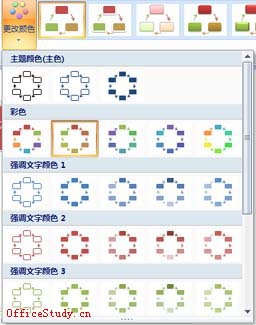 在选中SmartArt图形时,工具栏上就会出现“SmartArt工具”,下面还有“设计”与“格式”两大功能区,可以对图形进行美化操作。在“设计”工具中,可以对图表的色彩风格进行设置(如下图),只要鼠标移至模板上方就可以看到效果,十分方便。