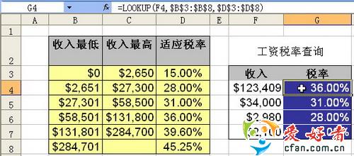 在这个函数中,用第1个收入“$123,409”(F4单元格)当作对比数,用它与左侧表(“$B$3:$D$8”)的第1列数进行对比,虽然“$123,409”在“收入最低”各档数中没有完全一致的数据与之匹配,但是函数的最后一个参数是“TURE”(“TURE”就是模糊查询),所以它会与其中小于它的最大数“$58,501”相匹配。并将表中第3列(函数的第3个参数为“3”)对应的数据提取出来,所以结果同样是“36.00%”。